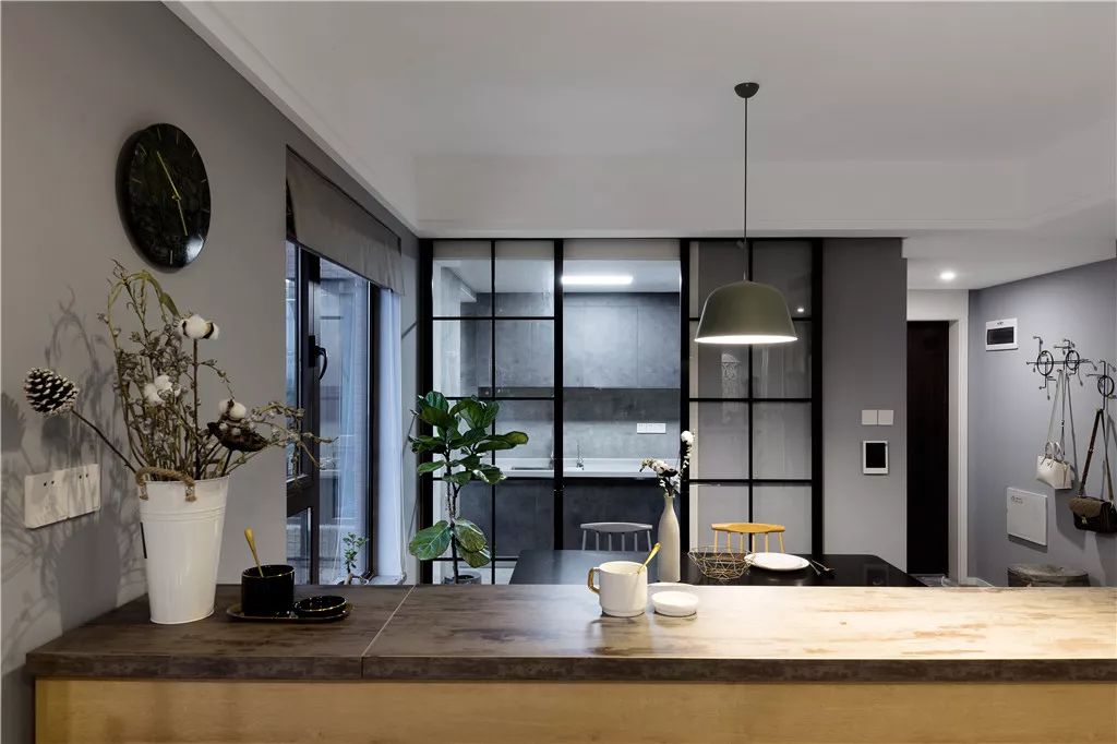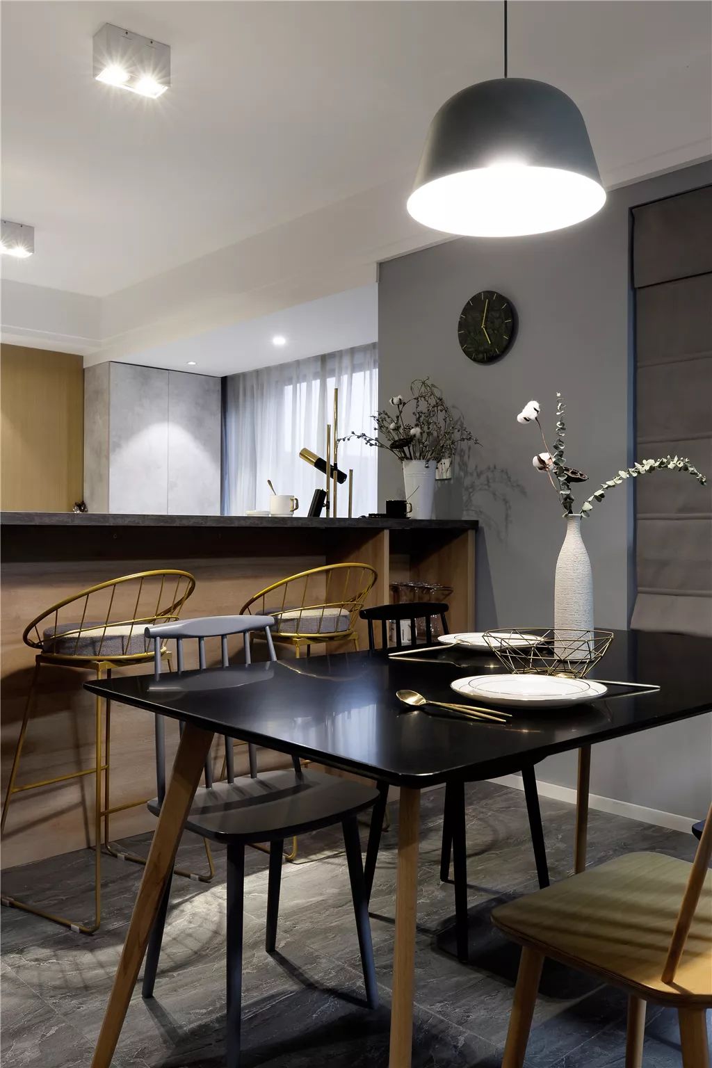 餐厅以黑色的餐桌+黑灰木色的餐椅布置,结合黑框的玻璃门,让用餐氛围更加端庄雅致而情趣。