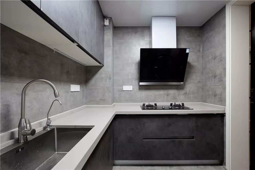 水泥灰颜色的厨房,L形的操作台布置,让做饭的空间也是轻奢优雅而又简洁大方。