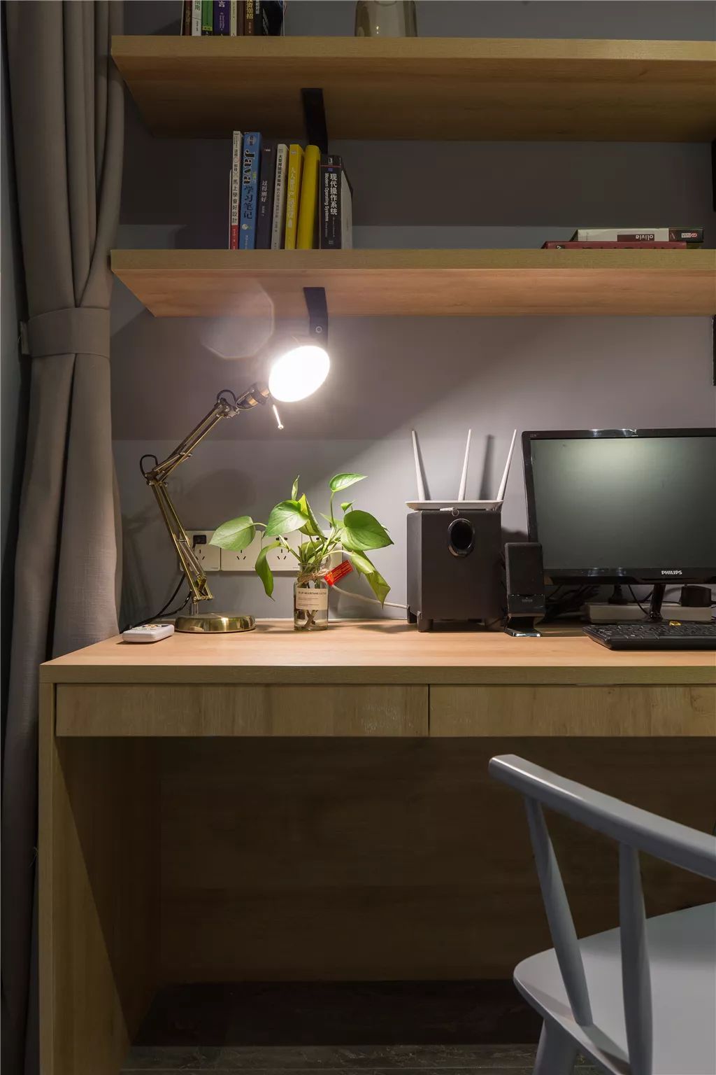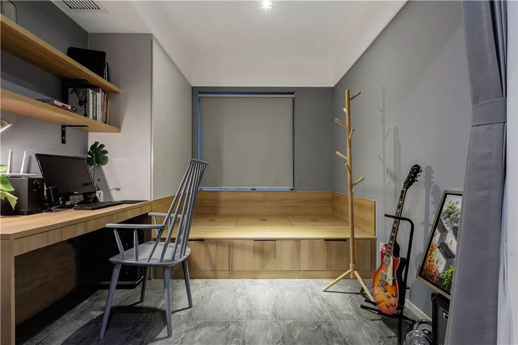 过道推门旁边的是书房空间,定制一张榻榻米床,一张木色的书桌,带来一个宽敞舒适的办公游戏空间。