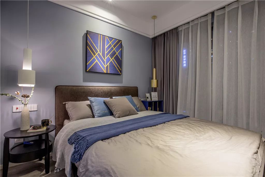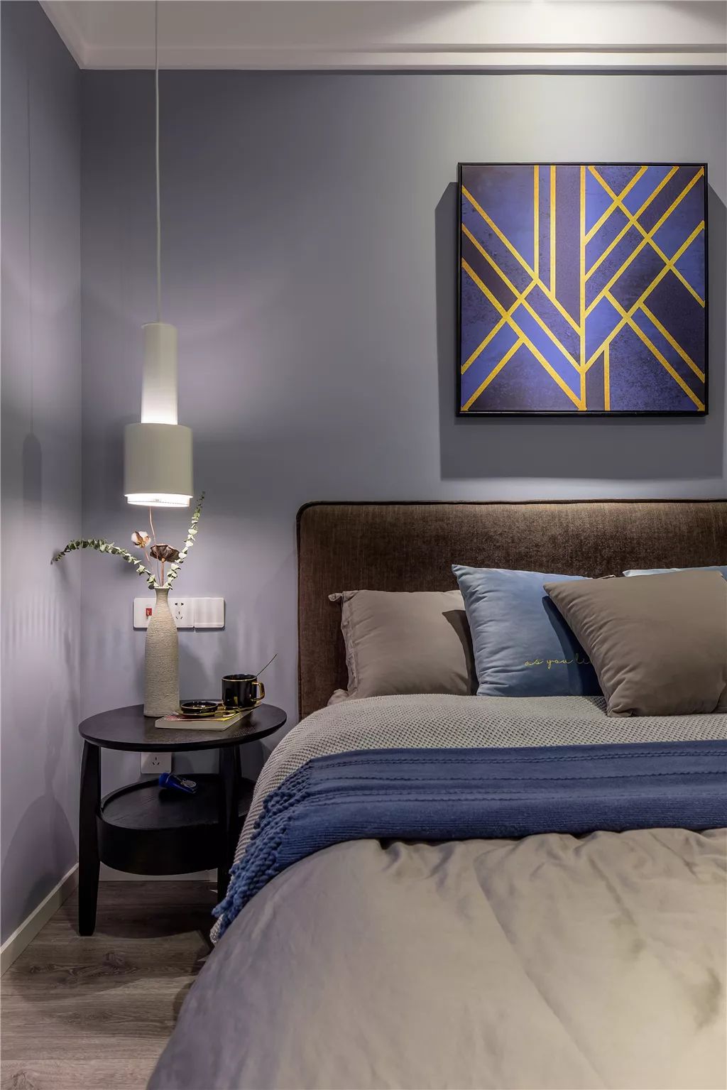 卧室在灰蓝色的墙面基础,挂上一幅几何线条的装饰画,布置暖灰色的布艺床铺,简洁素雅的床单抱枕布置,让卧室充满舒适轻松的气息。