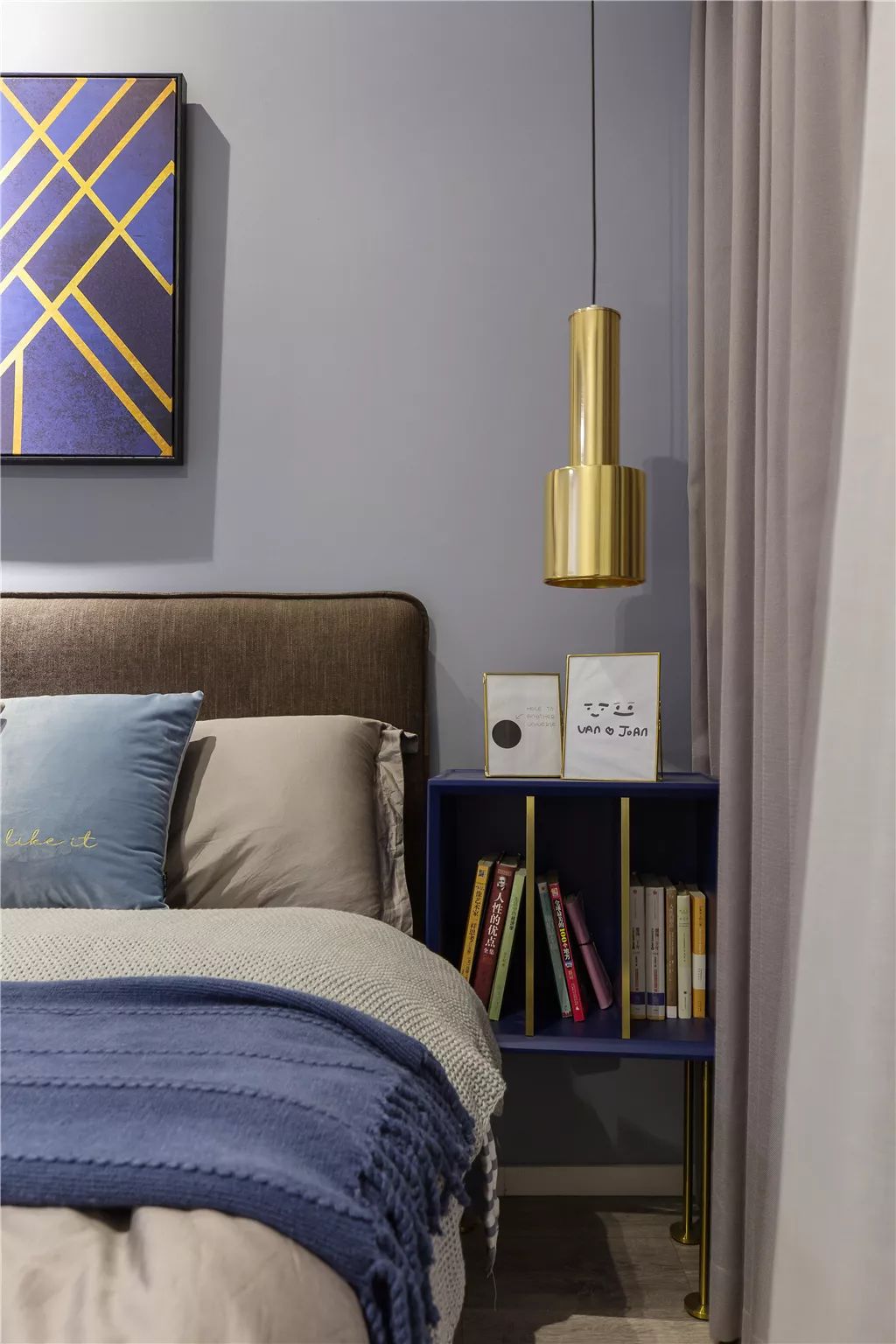 床头两侧分别是床头柜与小书架,白色与铜色的吊灯呼应,让空间显得更加活泼有趣。