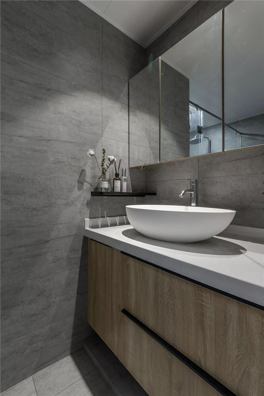 灰色地面砖+木色洗手盆柜,结合优雅的台上盆设计,让卫生间充满简约舒适的年轻气质。