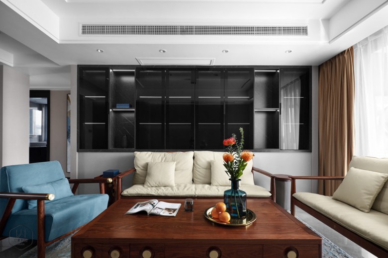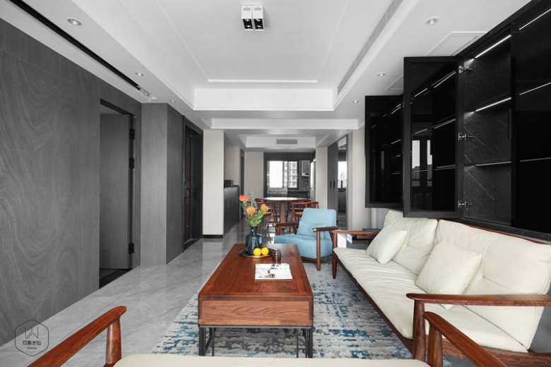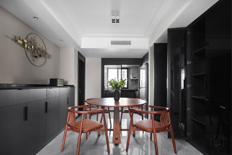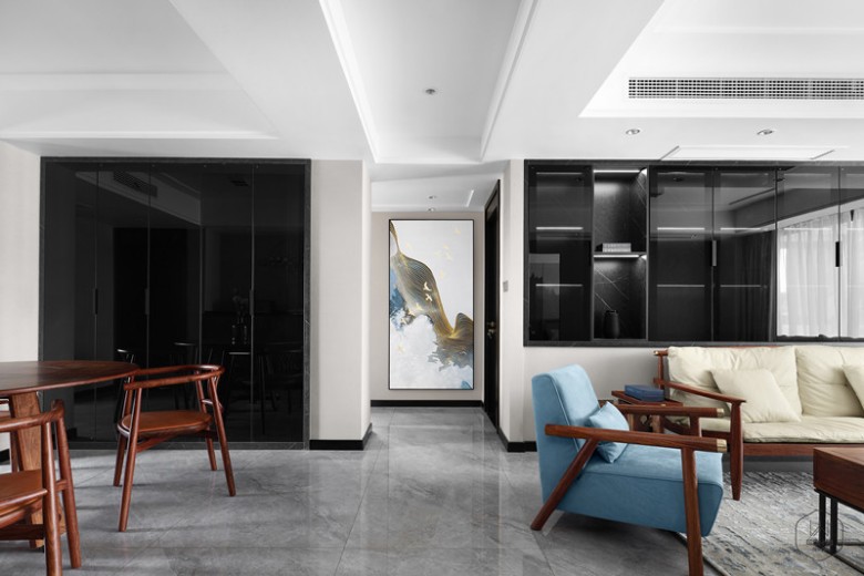 现代的形制中糅杂绵绵古韵,清风入室,辉光漫洒,宁静的不止是空间,更是心境。﹌﹌﹌﹌面积 / 125㎡风格 / 新中式户型 / 四室两厅两卫硬装设计 / 印象水仙软装设计 / 印象水仙 施工单位 / 印象水仙 ╱╱╱╱╱╱屋主夫妻很喜欢中式风格,但是又不喜欢过于复杂的装饰,所以希望设计师可以以简约为主,打造一个偏现代的中式空间;因此设计师的设计方案便围绕简约的硬装与中式韵味浓郁的软装而展开,整个新家会更偏现代化而韵味丝毫不减。 客 厅 门板展开▼ 伴着袅袅茶香,对生活的憧憬在心底暖暖漾开,新中式的雅宅带你预见诗中的遐想。现代的形制中糅杂绵绵古韵,清风入室,辉光漫洒,宁静的不止是空间,更是心境。 门板展开▼ 自然光线倾洒入室内,亭亭绿植与轻柔白纱在光影中相融,舒缓的生活就这样不紧不慢地拉开序幕。从黑色玻璃收纳柜、灰色木饰面、中式韵味沙发,再到艺术风地毯,以色彩的深浅对比带来层次变化。一物一隅,都有着时间沉淀后的独特气质。另以一抹温暖的姜黄色窗帘装束空间,赋予空间朦胧的芬芳气息。 选择投影仪代替电视机,没有了堵塞感且更具灵活性。 隐形门藏于木饰面中,增强空间整体性,同时也提升居住者的生活品质。 门板展开▼ 餐 厅 用美食交流情感,用圆桌呼应团圆。大面积沉稳内敛的黑色玻璃门板的设计,另一面则选择半高的餐边柜和精致的装饰,随生活动线的布局,传递着惬意与舒爽。门板展开▼ 过 道 在冷静醇味的色彩、简洁明朗的线条、卓越细致的工艺协调下,生活的艺术,于丝丝入扣的细节中流露出来。门板展开▼ 厨 房 从透明移门望去厨房,其黑白灰色系中搭配香槟色透露着些许温柔。主 卧 虚掩的纱幔,别致的摆件、床头背景墙选择中式韵味的硬装背景,将细微的闲情逸趣写入床头,让栖息更有一层诗意。 次 卧 次卧选择彩色背景,灰色系窗帘以及灯饰的设计带来舒适的质感,欢快活泼的橘棕色配合木色家具为空间增添了一份温馨感。书 房 一家人学的空间,没有太多的色调,用黄色与木色搭配,显得空间轻松舒适。卫生间 长虹玻璃做隔断美观实用,干湿分离的设计易于打理,设计师加入许多灯光设计,配合精心选择的蓝色墙地砖,艺术感十足。 合影纪念 所谓家人,绝不仅仅是割舍不断的血缘关系,更是风雨同舟的亲密陪伴。