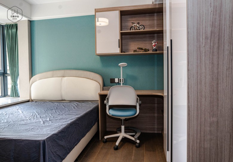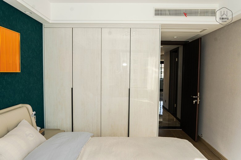 墨绿色的床头背景,米色的家具和床饰,一副横幅的橘色壁画,整体设计张弛有度。