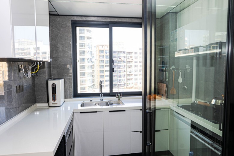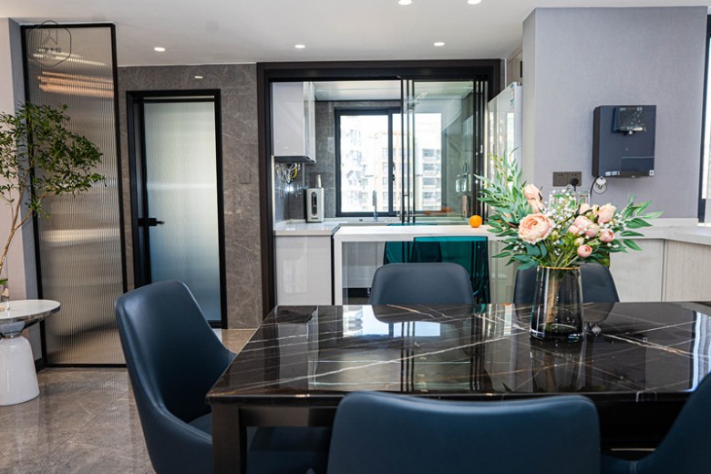 餐厅的空间相对很宽敞,厨房和餐厅中间做了L型吧台,进门处往里看,亦可作为半柜体隔断,美观、实用兼得。 黑色大理石餐桌搭配六张藏青色皮质餐椅,家具的光泽自带精致气息,白色吧台提升空间质感,在厨房做好丰盛的食物,与家人围坐享受美食,日常的生活就是如此。 KITCHEN | 厨房