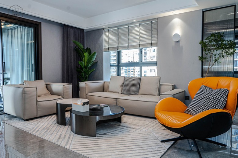 深灰色地砖、米色皮质沙发、松软的地毯、深色的窗帘,阳光洒在这片小天地,柔化了线条的冷硬感,使得整个空间温和又舒适。