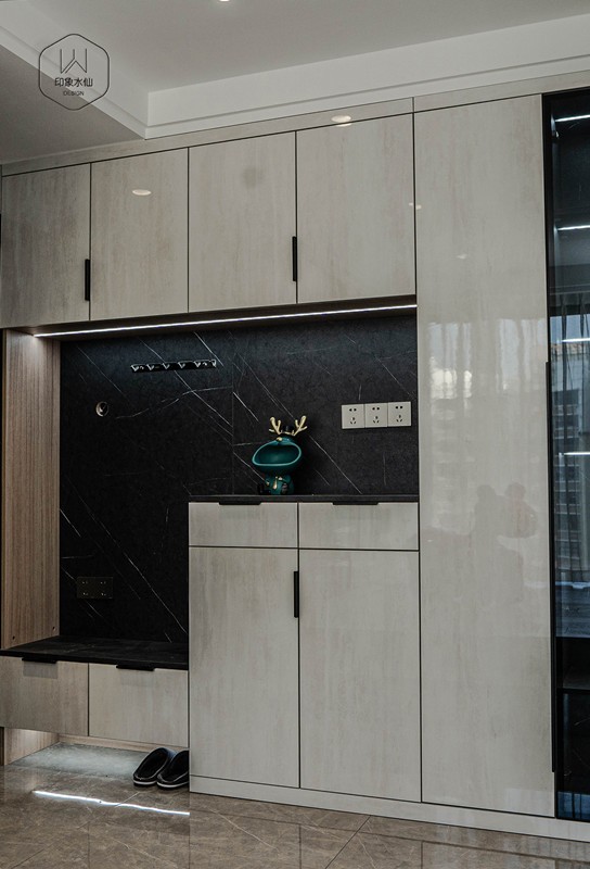 入户保留了孩子玩耍的空间,两侧做了高柜和鞋柜,局部选择黑色玻璃拼接设计,让入户空间不再单独;进门处的挂钩更是让空间有了家的归属感。