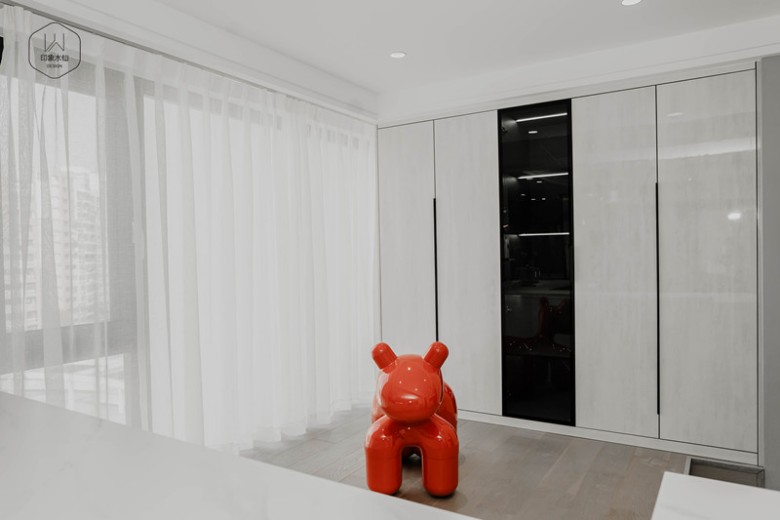白色爵士白大理石背景做了简单的凹凸造型和地台的设计,橘色元素在灰白色的基底中进行调和,让原本沉静的空间充满活力。