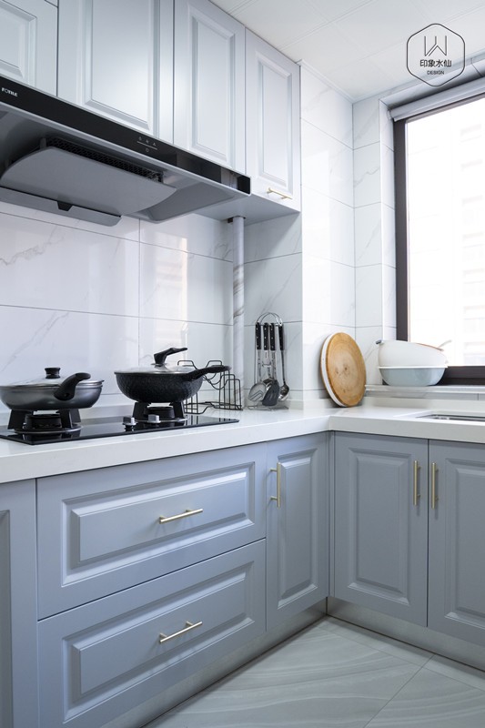 灰蓝色系的橱柜搭配白色墙砖和浅灰色地砖,深浅层次错落有致。 主 卧