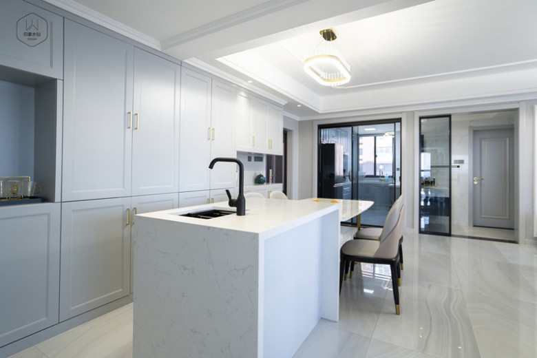 餐厅空间增设中岛吧台,与餐桌椅保持流畅动线,满足了屋主日常的休闲需要,也可以作为厨房备餐区域,沟通餐厅与厨房之间的对话,实用且便捷;大面积纯色餐边柜,赋予空间精致的美感。