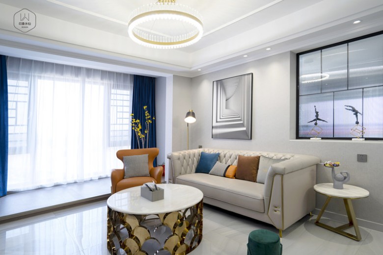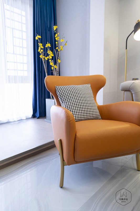 硬装上以灰色为主,顶面和电视背景墙做了石膏线的造型,纤细的线条带动了周围整体的氛围,沙发选用了米色皮质沙发,为避免素色空间带来的乏味感,以橘色单人椅加绿绒布沙发凳点缀,搭配带有金属质感的茶几和电视柜,将精致时尚融入生活的每个细节。
