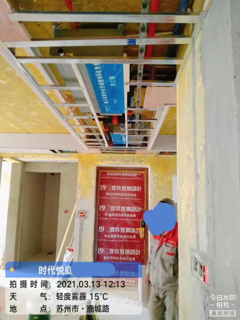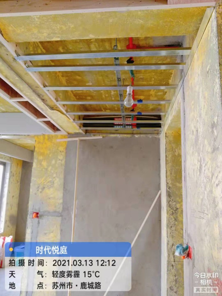 【施工内容】:验收木工吊顶龙骨基层处理情况,厨房窗台高度查看