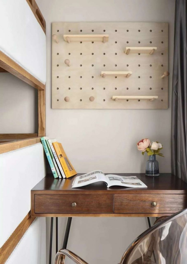 靠窗处辟一隅作为写字台,未来可以做为孩子的学区,墙面的洞洞板,可随意增减隔板,满足不同的置物需求,美观又实用。