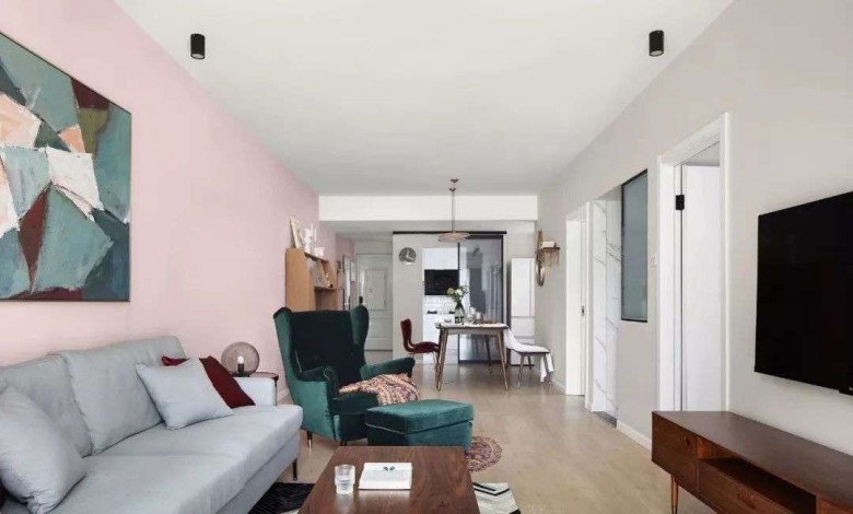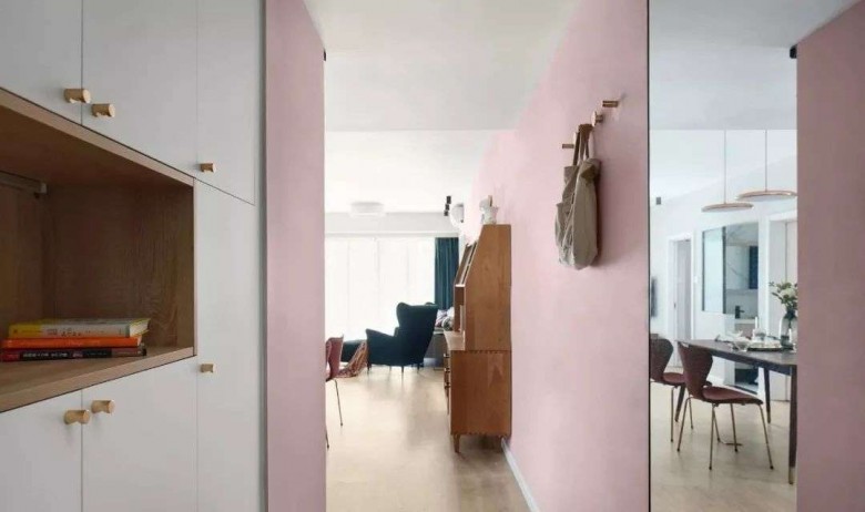 粉色背景从玄关一直延伸到客餐厅,也在整个简暖调性的居家氛围中,融洽得恰到好处。