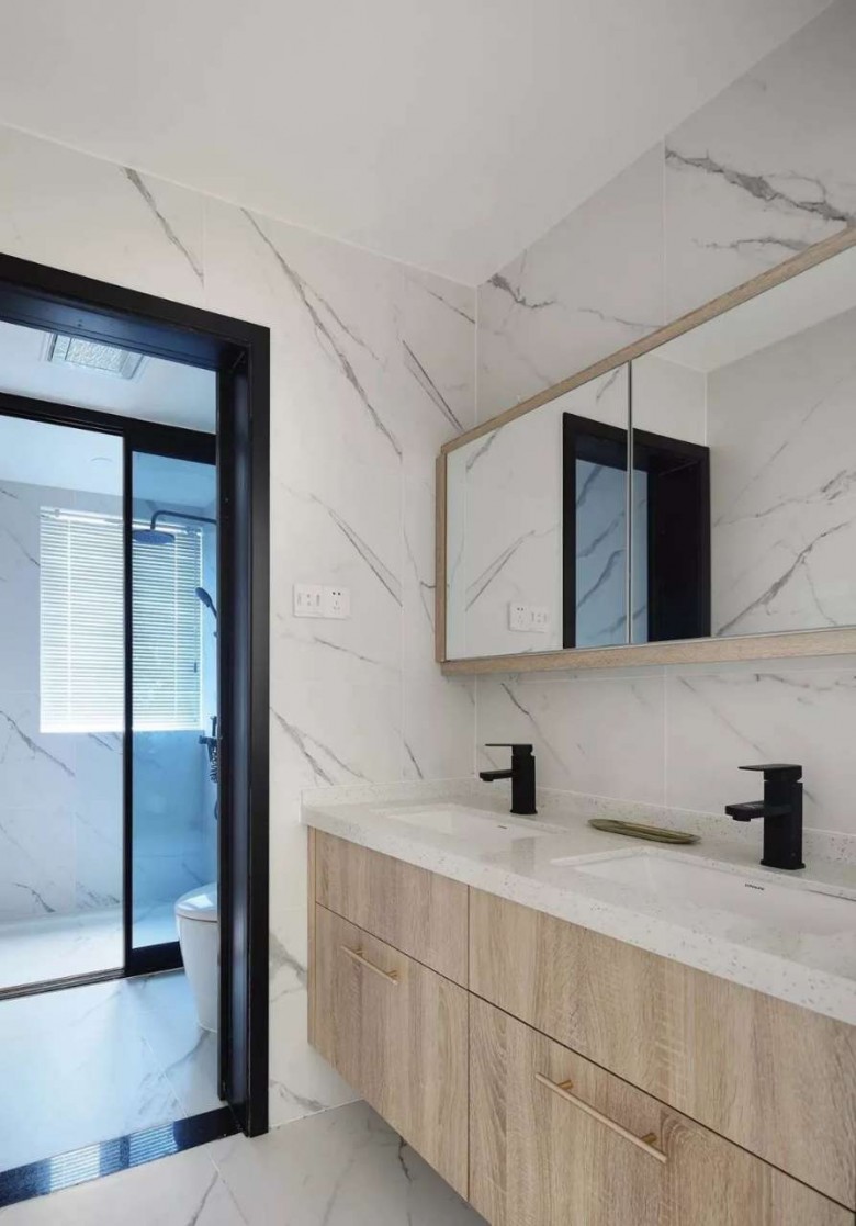 原进出两卧室的小过道改造成拥有双台盆的超大洗手台区域,实用美观兼具。洗手台外置设计实现卫浴的干湿区域分离,三段分离,生活起居更为便利。