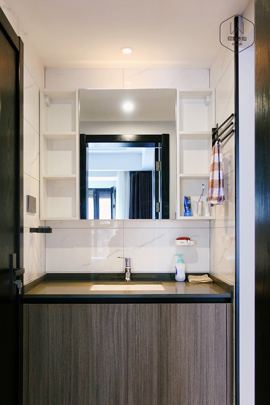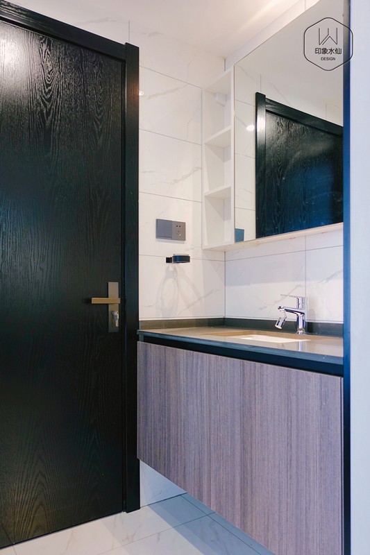 卫生间干湿分离的设计,黑色木门,搭配胡桃木色门板,结合白色柜体组合浴室镜柜,高级耐看,每一处精奢品味都行走于时尚前线。
