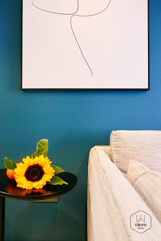 主卧对于主人的专属性、象征性更强,床头背景的表现手法与客厅如出一辙,蓝色背景结合白色定制挂画,简约又自带艺术感。