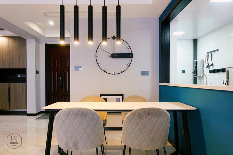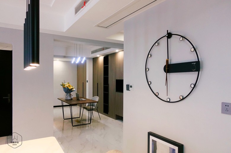 墙面上的挂钟,简约的调性与客厅的质感交相呼应;厨房在自然光线上,稍微欠佳,因此设计师将用餐区和厨房中间的一面墙敲掉,改用玻璃隔断代替墙体,为厨房空间增强采光。