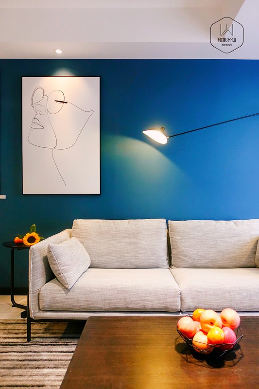 客厅沙发背景跳跃的蓝色占据了客厅的视觉中心,灰色质感的沙发,搭配黑色个性落地灯和边几,观感高级。
