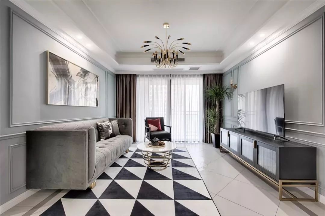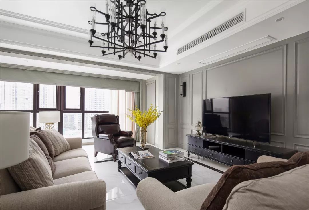 很多业主也会选择把沙发背景墙和电视背景墙都做上石膏线边框线条,做出对应的造型、相互呼应,这样整体感更强。
