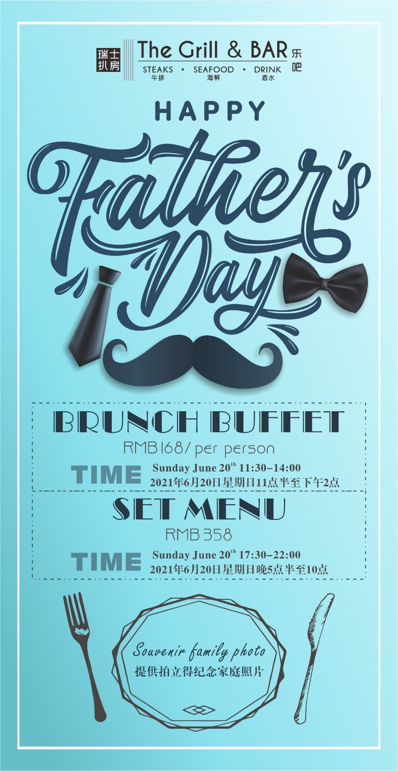 昆山瑞士大酒店一楼瑞士扒房,不管是丰盛的早午餐,还是超值的双人套餐,一定能让父亲节锦上添花!