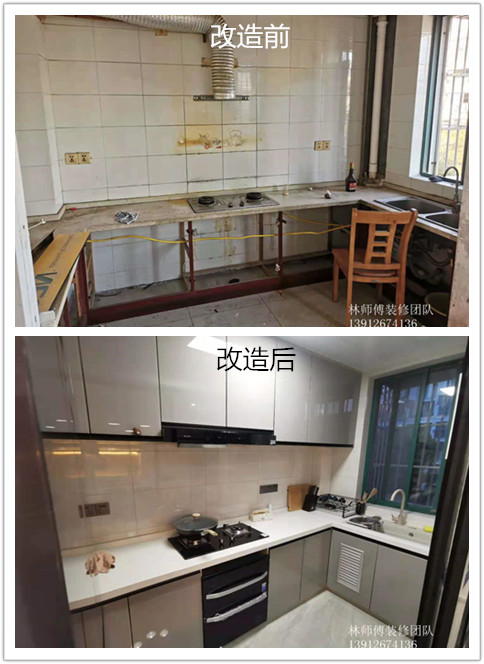 改造前的厨房,随处可见的油渍、污垢,但是经过改造后,立马不一样了,干净整洁了不说,颜值更是提升了不少。灰色橱柜非常大气,U型设计,上下橱柜,储物能力也是大大提升了。