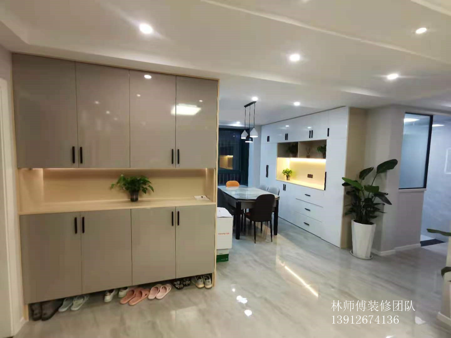 房子原来是没有玄关的,翻新后,在门口另外设计了一个鞋柜,也将客餐厅做了分隔。香槟色的鞋柜非常时尚好看,鞋柜中间留空用来放东西,底下镂空用来放穿脱的鞋子,方便整理。