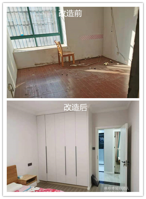 主卧改造前也是一样,墙面都脏掉了,红色地板也已经out了,改造后,灰色地板好看时尚,到顶的白色衣柜整体统一,在靠近窗口处还设计了一个书桌,既能办公,又能做化妆台,非常方便。