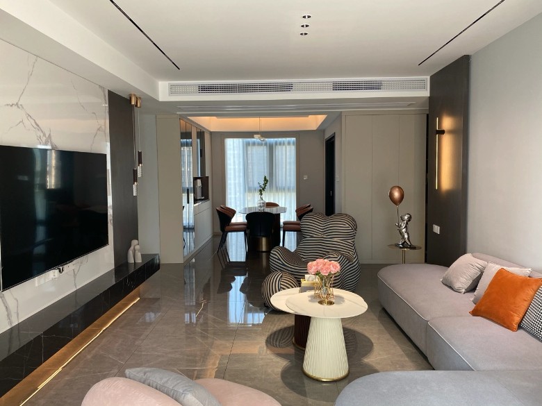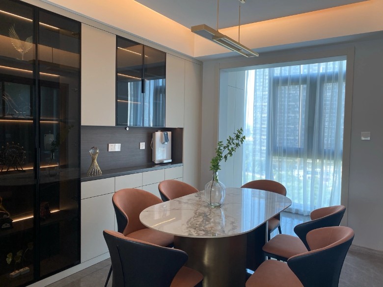 线条灯让空间更简洁,线条流畅,全包项目,历时3个月,每个环节无缝衔接,所有软装家具进场,每一个陈设饰品的搭配都是必不可少。