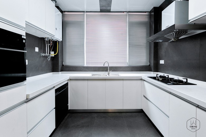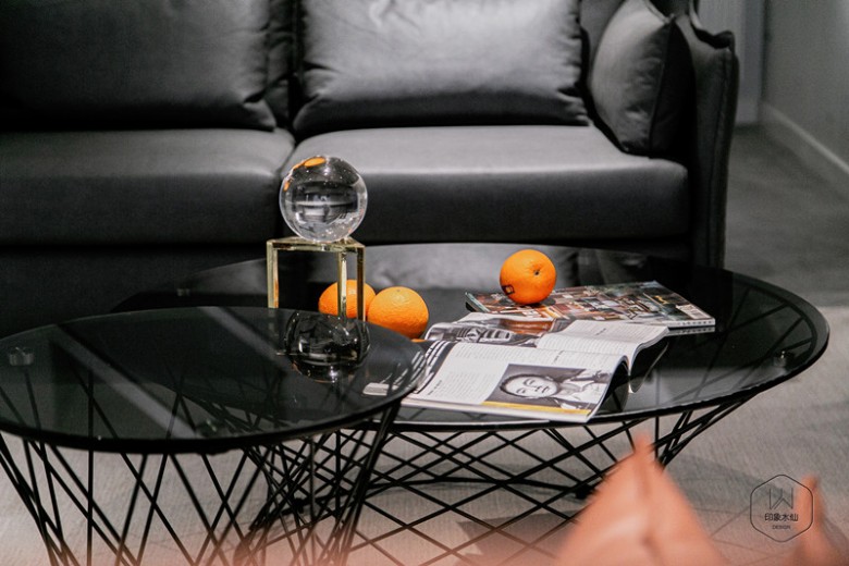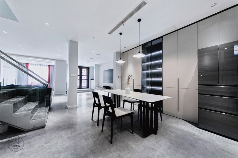 入门之后的视野是敞开式的大厅,并没有刻意划分空间。客餐厅、过道,公共区域的连接相通却又独立。没有多余累赘感的家居,很大程度上减少了压迫感,在灰色的地砖与黑白相间背景下,更简洁舒适。