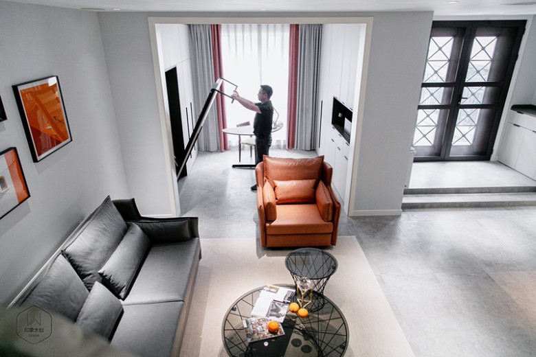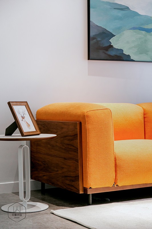 客厅区域采用无主灯设计,柔和的灯光赋予空间更强的层次感和艺术力;几何感的墙饰,橘色的碰撞,营造出强烈的视觉冲击,亦让人沉浸在舒适自然的空间里。