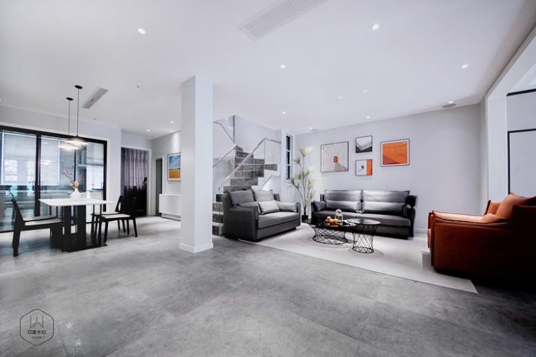 本案是一个250㎡的复式楼,一家三口在这里居住,屋主平时事业较为忙碌,希望设计师可以打造一个“慢节奏”的空间,让家庭成员们回家后可以完全放松下来。 屋主喜欢现代风,又想要舒缓的“慢节奏”,因此设计师没有完全选用黑白灰的色调,也加入了柔和的大地色凸显温馨氛围,利落的线条配上亮色装饰生动不枯燥,每个部分都得到合理设计,期望给予屋主“张弛有度”的生活。