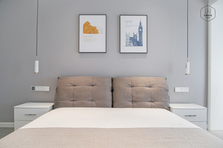 明亮的光线是原户型的礼物,设计师选择浅色硬装突出采光优势,浅灰色温和慵懒也是屋主喜欢的调调,几抹亮色是减去单一的利器,在简约中找寻与众不同。 MASTER BEDROOM | 2F主卧
