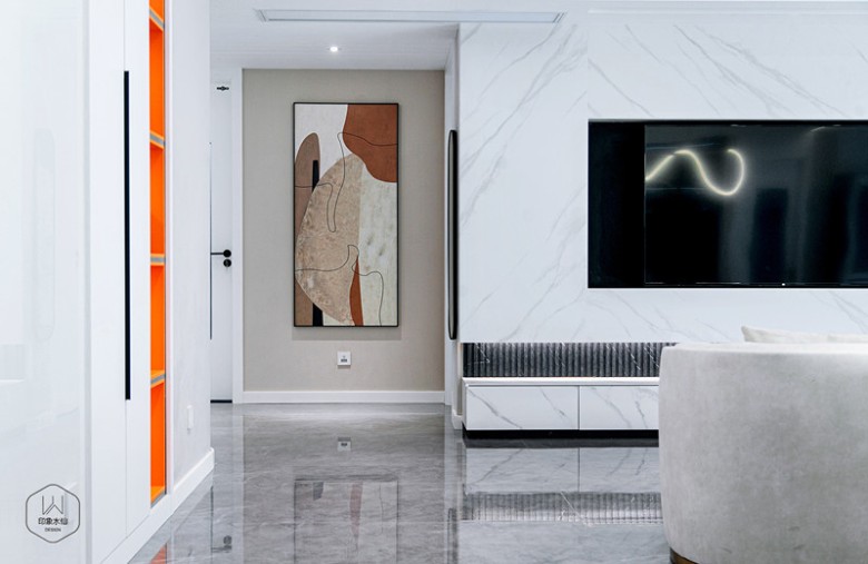 过道一面极简定制立柜赋予空间充足的收纳功能,内设隐藏式的灯带,营造无处不在的高级感。