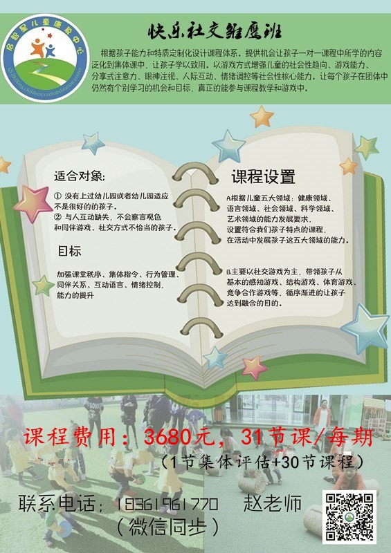 游戏课程我国著名的教育家杜威曾经说过,在幼儿阶段“生活即游戏,游戏即生活”。对于学前儿童来讲他们除了吃饭、睡觉外,在一日活动中,他们大部分时间都是在做游戏。而游戏不仅是幼儿最喜欢的活动,同时也是幼儿园对幼儿实施教育的主要形式之一,它在发展幼儿知识、技能、情感等方面的教育价值越来越受到人们的重视。 我们的孩子由于发育的偏移,不会和同龄孩子玩游戏,或者很难参与到游戏中去,不理解游戏的规则,从而,影响孩子的社交和融入幼儿园的生活。一.课程方式根据孩子的评估情况,安排一对一、一对二、一对多等课程班别。二.课程内容通过游戏介入,解决特殊儿童的社会核心能力(包括主动性、眼神、声音、观察、和模仿能力等)。特教老师在特定的环境中,以游戏的方式提升儿童的核心能力,经由家长在家的配合与活动延伸,培养孩子的主动性,建立情感的交流,切实让儿童感受到与人交往的乐趣。由老师设计符合孩童能力与兴趣的活动,在游戏中加入目标、规则,借助各种游戏活动,大量扩充孩子的生活经验,增加认知学习能力,提高解决问题的能力,全面提升孩子的社会性,籍次拓展孩子的社会核心能力。三.上课时间周一到周五,周六或者周末,每节课50分钟,可以提前沟通预约时间。