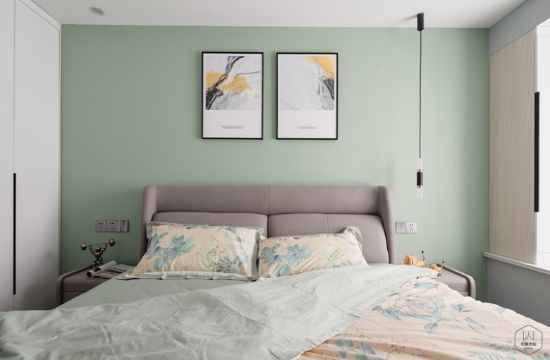 恬淡的薄荷绿搭配纯净的白色,简洁大方,床头单侧吊灯的设计,个性十足。