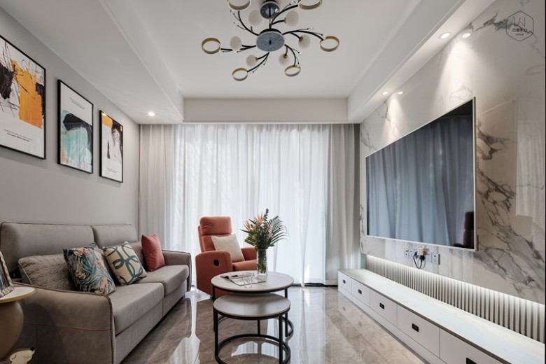 落地窗投射入的阳光,用温暖给整个空间开路。映衬出岩板背景墙以及地板的通透、开阔。空间中流淌的,是无尽的舒适感。