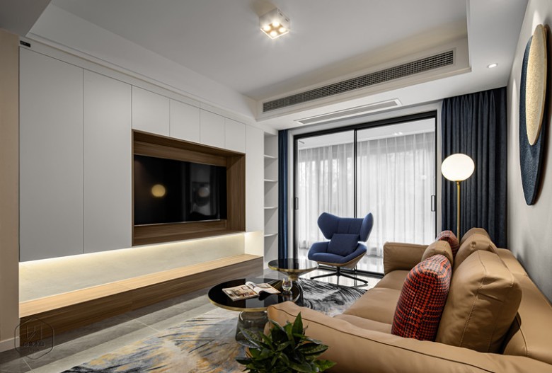将目光落于电视背景上,白色收纳定制柜搭配原木色地台,埋入线性灯条,营造出极强氛围感。