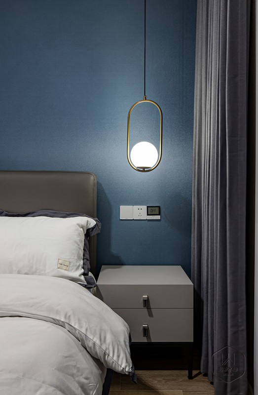 © GUEST ROOM 次卧 次卧空间,整体明净的空间底色下,一抹蓝调跃然心上,让空间跳脱乏味与沉默,引人坠入澄澈清新的海洋。 轻暖的灯光搭配着床的柔软,由内而外地散发着属于这个家的温柔。