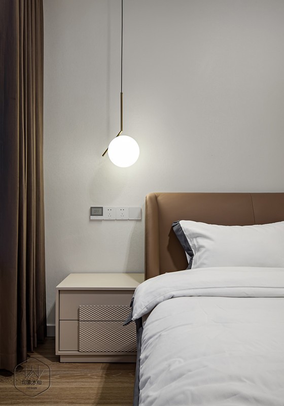 © MASTER BEDROOM 主卧 主卧空间,这个隔绝外部一切纷繁喧扰的私人领地,设计师在此极力营造一份业主追求的温柔与妥帖。 木饰面与肌理型墙布将主卧床头背景一分为二,不对称感及左右材质的不同使空间层次更丰富;橘色大床优雅中透露着慵懒,每当夜幕时分,一盏极简的吊灯照亮精致的床头一景,浪漫因子在这夜色里欣然起舞。