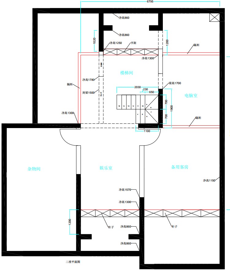 阁楼是斜顶的,面积跟楼下是相同的面积,只是边角高度比较低,也没有窗户,周围的立墙只有800MM左右,也没法装窗户,准备装几个排风扇。本来打算在顶上开天窗的,但是上面盖的有瓦,而且害怕后期漏水就放弃了。所以周围比较低(小于1.4米)的地方就隔起来放弃掉了,中间能用的地方大约在45个平方左右。大概的布局如下图。目前楼下的空间基本够用,楼上用的几率比较低,后期如果有其他的想法,再对阁楼进行改造。
