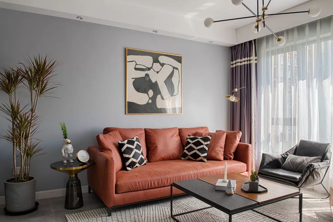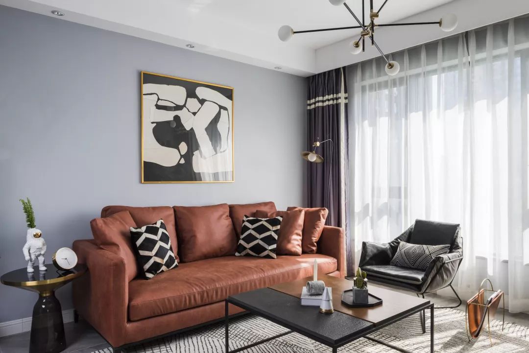 ▲ 客厅,用灰色调作为房间的基调,以焦糖色沙发与黑白交织的抱枕搭配,一种高级感在空间展开。