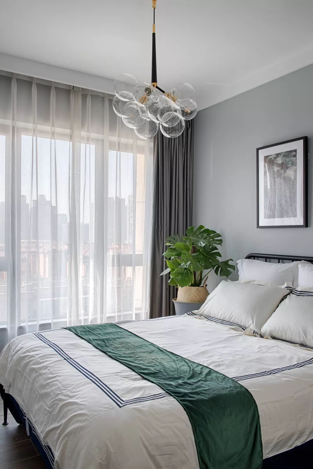 ▲ 次卧墙面选择了低调的灰色,黑色的铁架床搭配白色的床品简单耐看,金色边几与台灯提升质感,加入绿色的盆栽增添自然与活力的气息,细节之处都是点睛之笔。