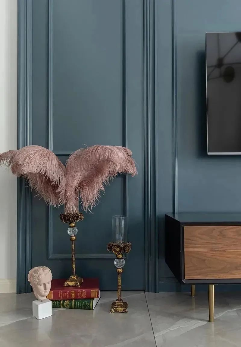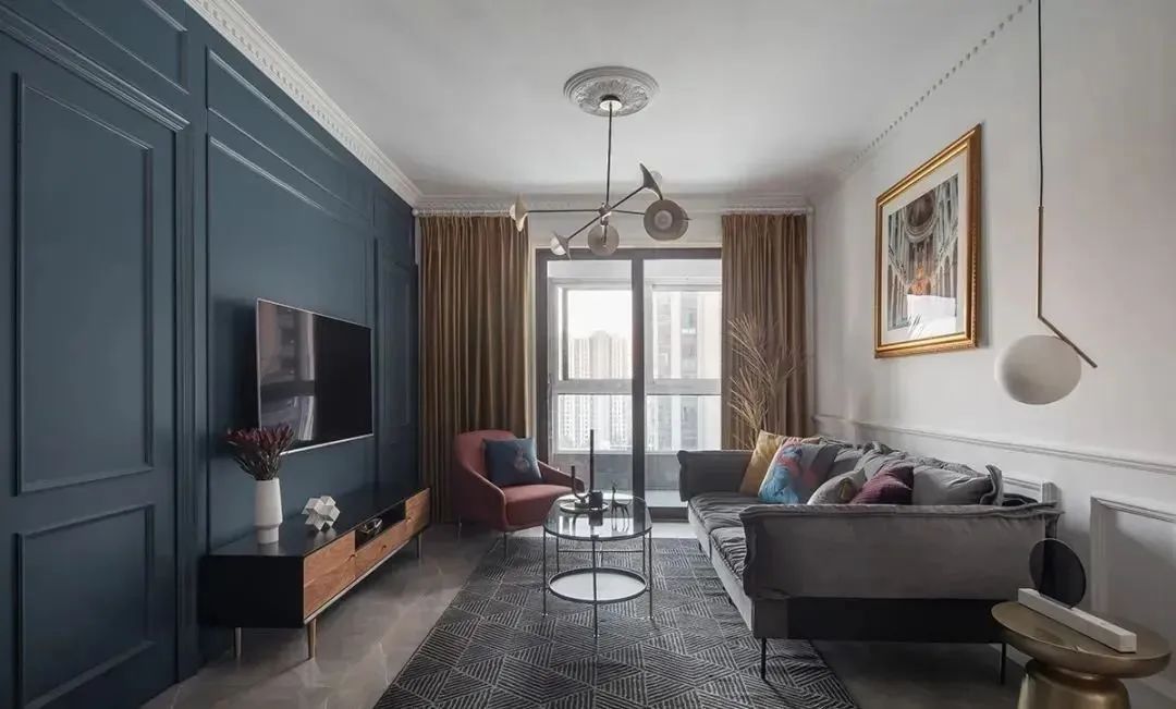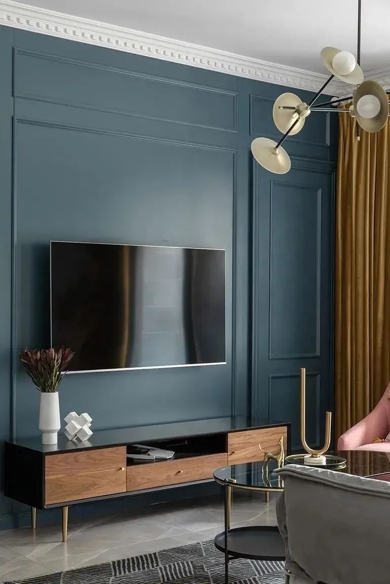 整面深蓝色电视墙,线条勾勒,简约不失美感。电视柜融入木质元素,更亲切舒适。极具艺术感的饰品,也能彰显主人气质。
