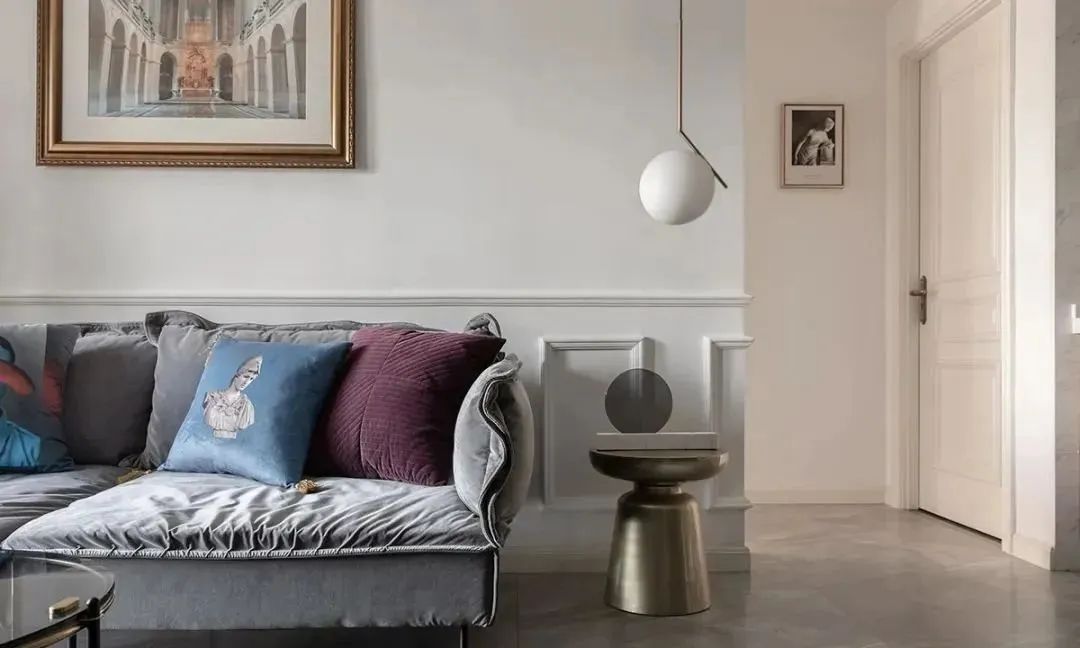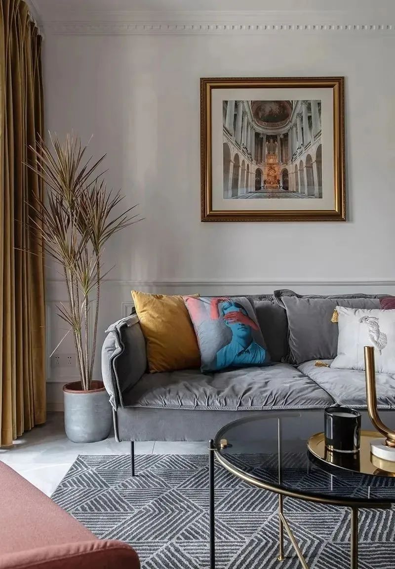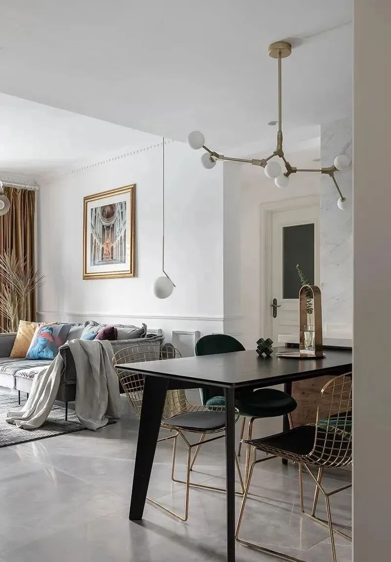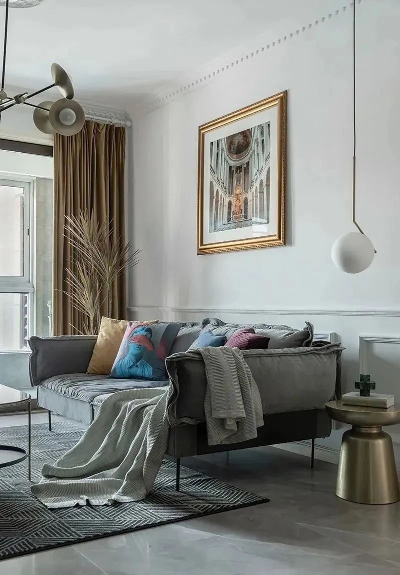 沙发背景墙,浅色系,用挂画装饰,简单时尚。客厅融入了一些轻奢元素,如吊灯、茶几等,让效果更精致了一些。