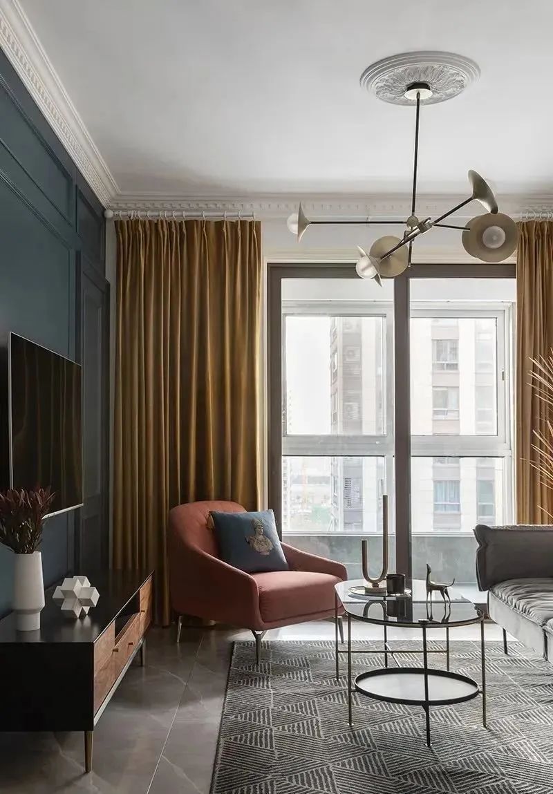 暖色休闲单人椅、黄色窗帘等,能够平衡色彩,让客厅更轻松、活泼、丰富一些。悬挂的吊灯,造型个性,带着一些复古范气质,很别致。