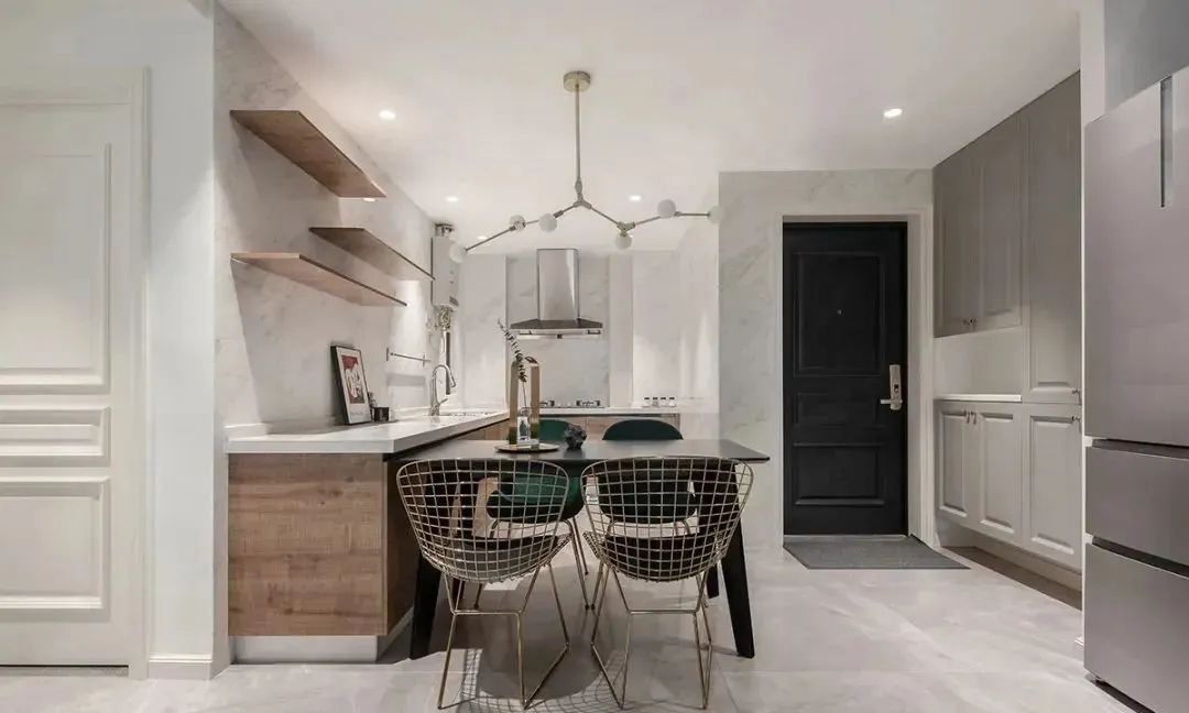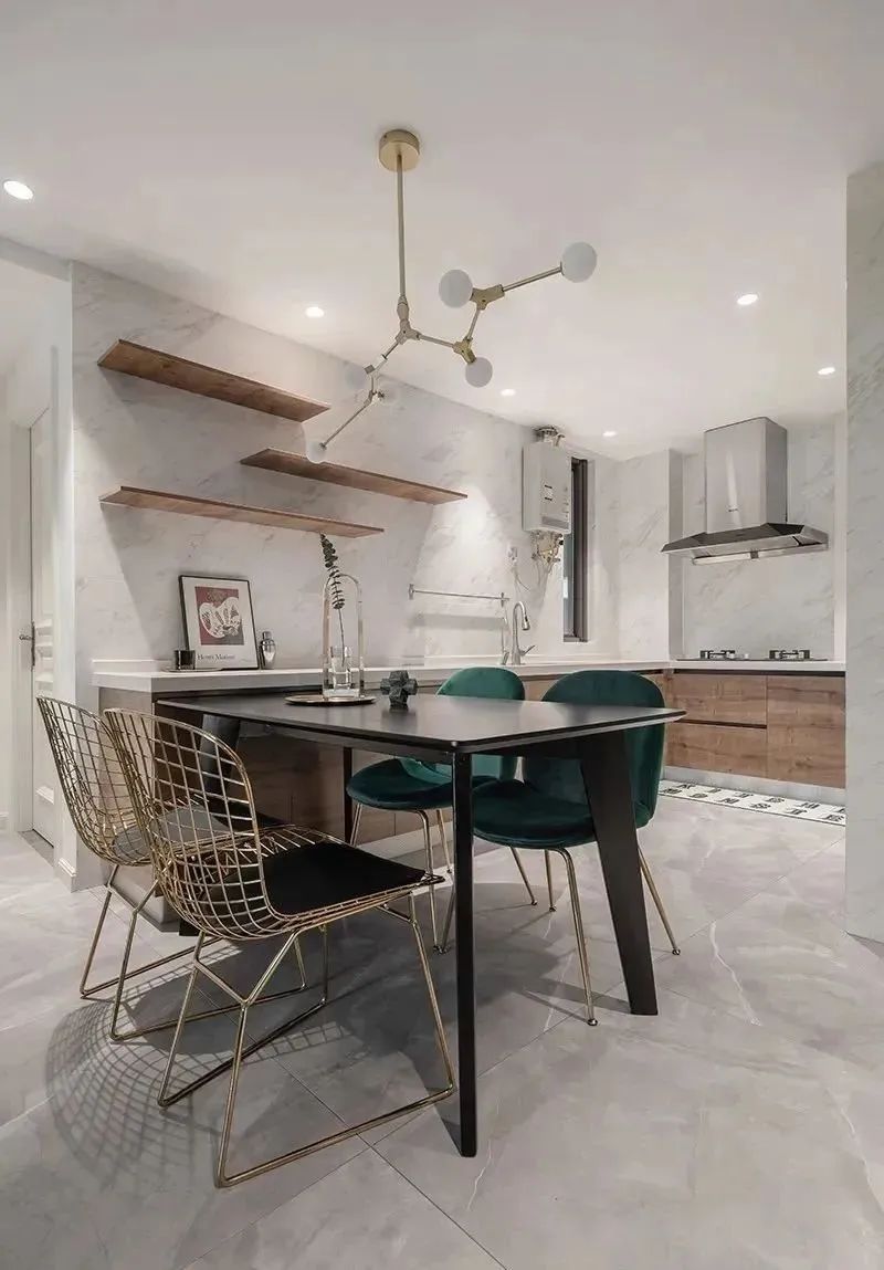 厨房浅色墙砖,挺有质感,不装吊柜,用隔板代替,一样可以简单收纳,并且还看着宽松。餐椅一边精致时尚,一边复古有范,很个性。