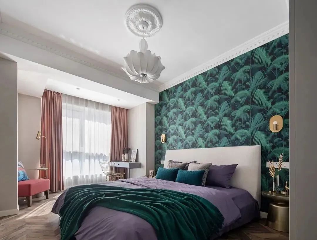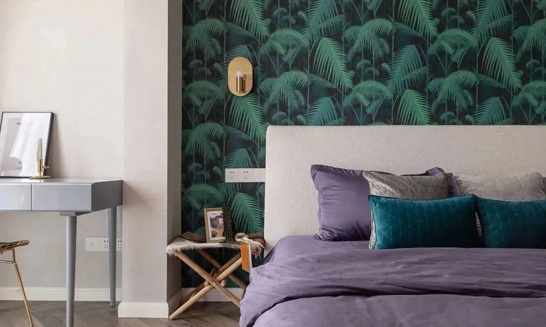 床头背景墙墙布铺设,绿植植物图案,给空间增添更多自然气息,很清新。一些金色饰品,如壁灯、边几及上方饰品,又很好的点亮了空间。