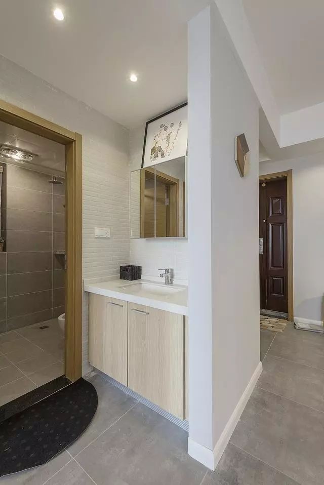 进门玄关的后面是洗漱区~清新的原木色柜子、白色砖,都给人一种很自然的享受