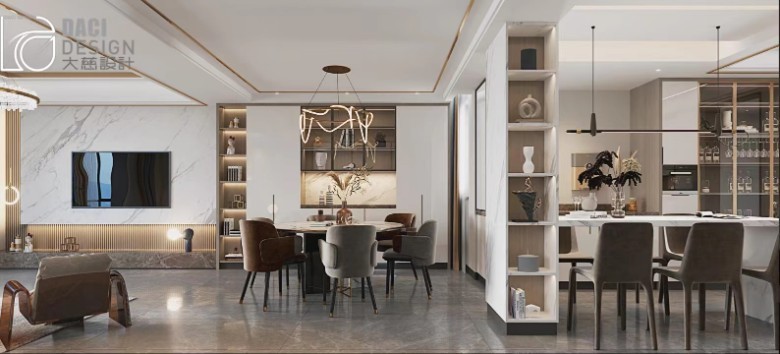 本期案例坐标│江苏·昆山区域│溪谷园53#3**室户型│别墅面积│249.5㎡风格│现代设计师丨王工家是灵魂的舒展之地,亦是我们相处最久的老朋友。它贮藏着我们对生活的热爱,也收纳着我们对人生最真实的体验。因此我们认为空间不仅仅是用来居住的,更是用来感受的。设计理念设计以现代格调为主旨,通过高级灰、质感棕等大地色系的加入,让钢筋铁泥浮现出根植自然的蓬勃生命力。大理石石材的运用,更予以空间叠加式的原生态品味。软装所选用的高级面料与皮革,配合如琴键般璀璨的水晶吊灯,无不在细节处渲染出高级与精致的效果。简单不失个性的吊灯,与冷邃的大理石餐台形成强烈的视觉反差,金属质感餐桌边框加入,在低调中诠释着现代情调的精致与奢华。
